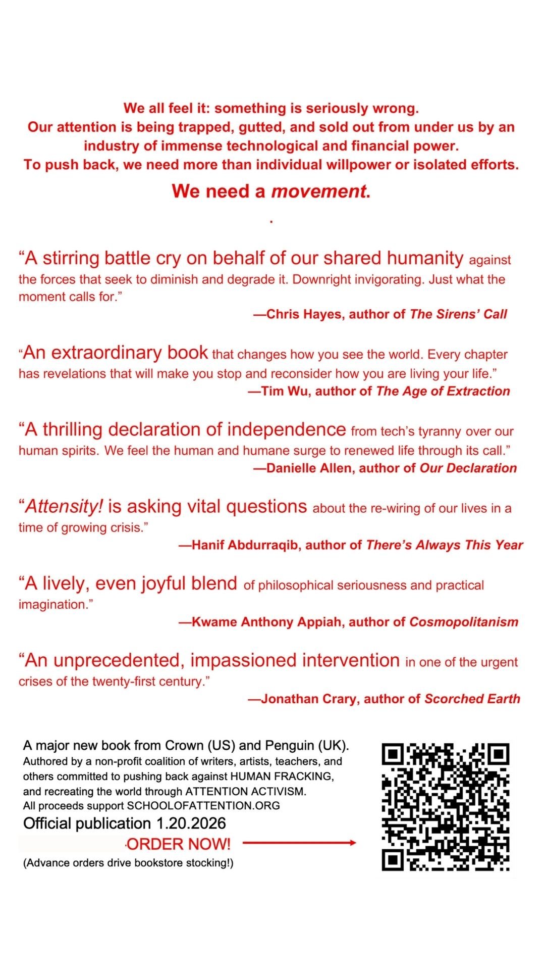 Forthcoming from Crown (US) and Penguin (UK) and authored by the Friends of Attention coalition, ATTENSITY! A Manifesto of the Attention Liberation Movement is a rallying cry to Attention Activists everywhere.