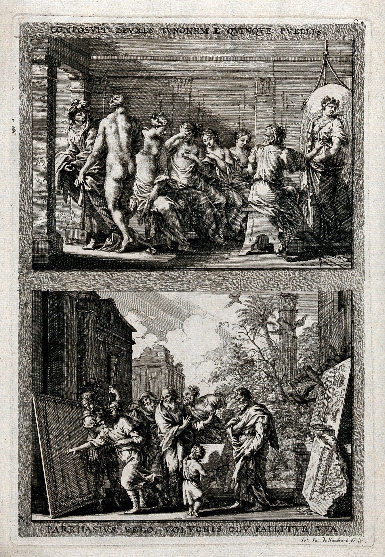 (Above) Zeuxis painting the portrait of Juno from the features of five different women; (below) Parrhasius deceives onlookers with a painting of a veil over a painting, and birds with a painting of grapes. Etching by J.J. von Sandrart after J. von Sandrart. Wellcome Collection. Source: Wellcome Collection.